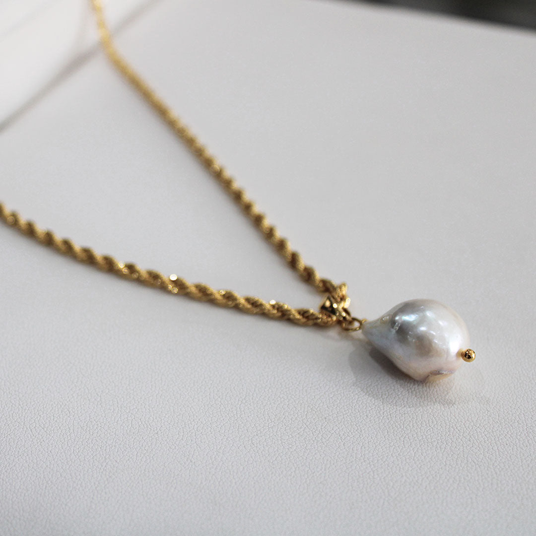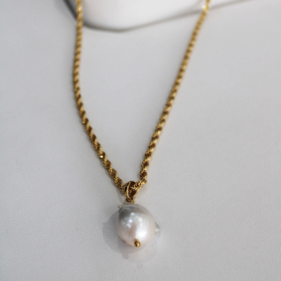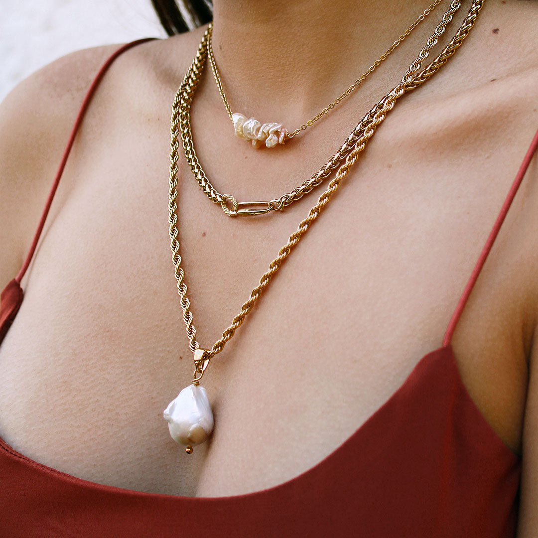 ¡El collar Alon es el componente perfecto para agregar a todos tus layers! La cadena torzal le agrega textura ¡al igual que la perla irregular!